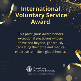 Awarded every other year, the Physician Award for International Voluntary Service celebrates members who go beyond the call of duty to serve their communities. Nominees must have engaged in volunteer community service that may be described as distinguished for one or more of the following reasons: